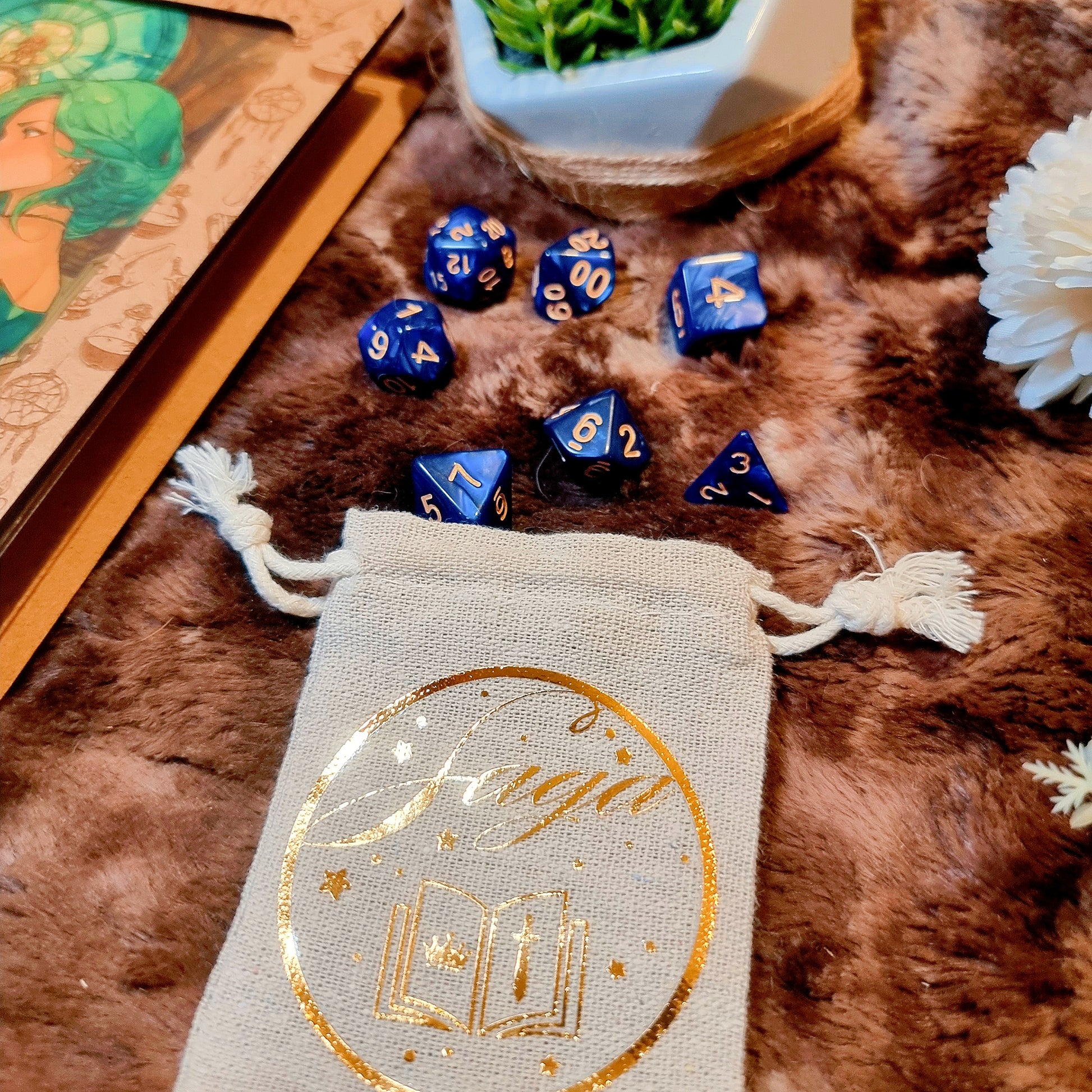 Un set complet de dés (7 dés) dans leur pochon en lin, prêts à faire tourner ton destin.